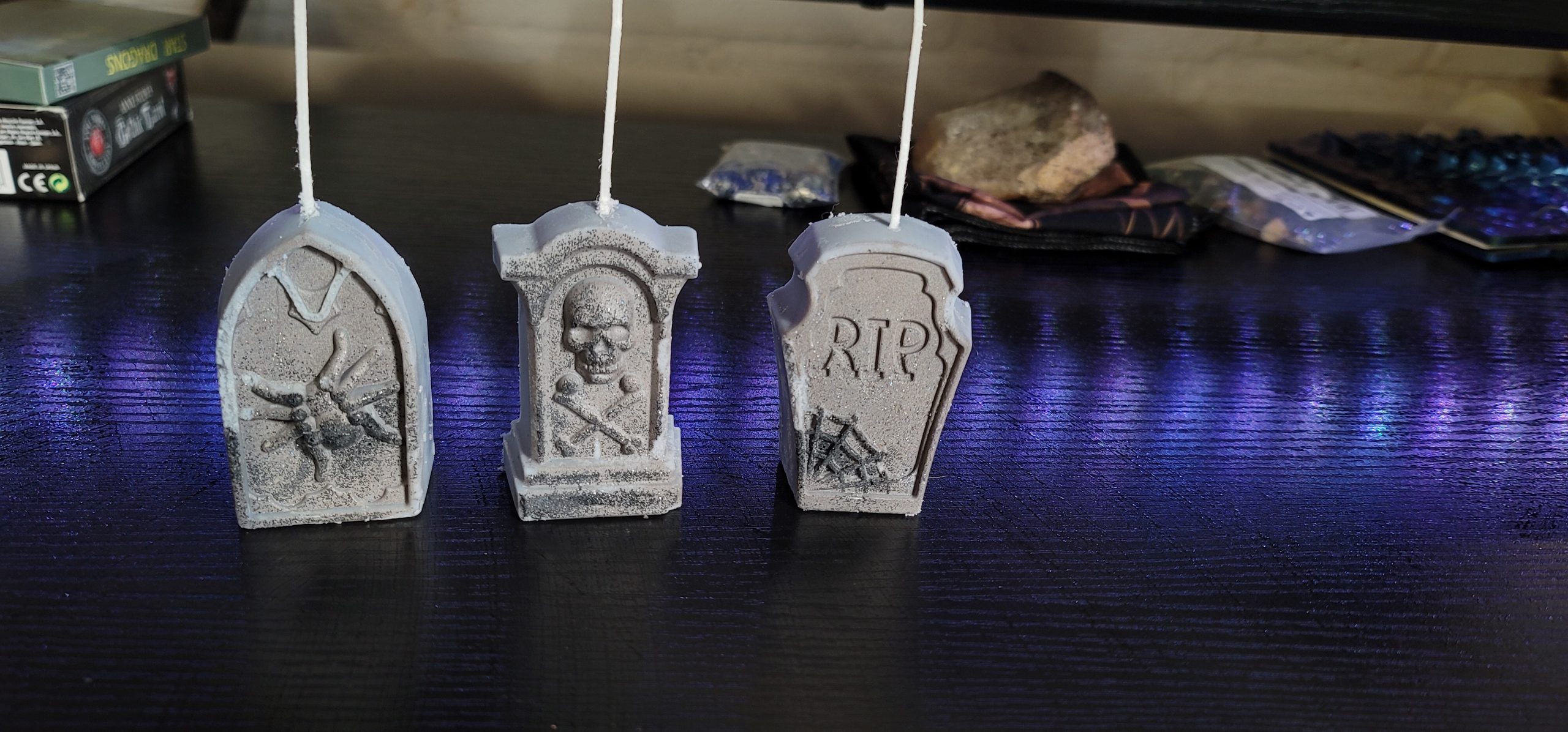 | Shape | DND 20 Dice, Skull, Skull with Snakes, Tree, Witches Crystal Ball, Speak, See, Hear No Evil Stacked Skulls, 3 Gravestones, Veined Hand holding Skull |